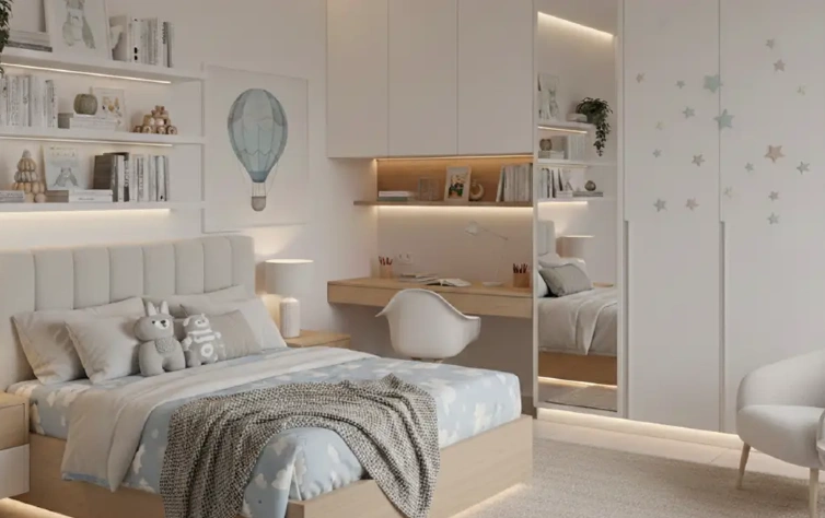 No dormitório infantil planejado, o projeto precisa acompanhar o crescimento da criança e se adaptar a diferentes fases da vida. Segurança, resistência e modularidade são prioridades, permitindo ajustes ao longo do tempo sem a necessidade de substituir todo o mobiliário. Essa lógica também se aplica ao quarto de bebê, que exige soluções seguras, flexíveis e fáceis de adaptar nos primeiros anos, garantindo conforto para a criança e praticidade para os adultos.