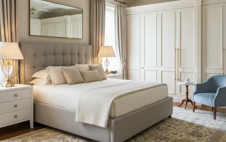 - Em dormitórios de casal, tons neutros, texturas suaves e padrões discretos reforçam a sensação de aconchego e ajudam a criar um ambiente mais propício ao descanso, sem interferir na leitura do mobiliário.